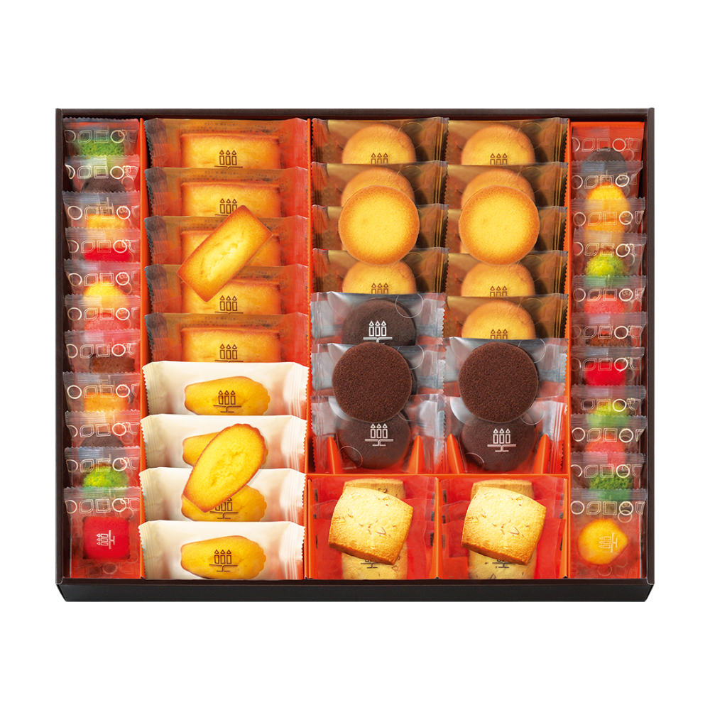 フィナンシェ×5、マドレーヌ×4、クリームサンドクッキー(プレーン×9、チョコレート×5)、アーモンドクッキー×6、ひと口焼菓子×22