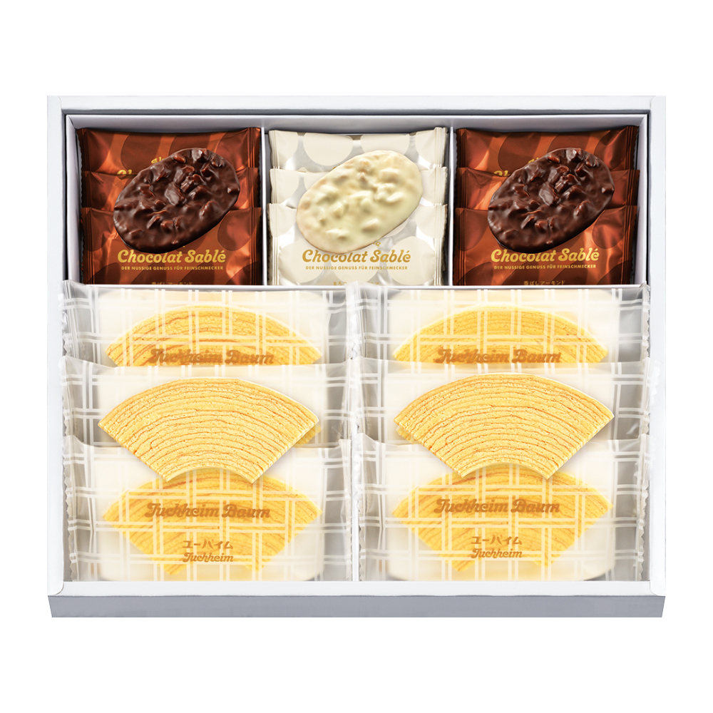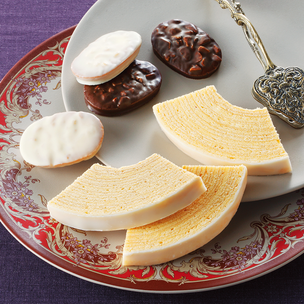 乳化剤や膨張剤を使わず、しっとりと焼きあげた伝統のバウムクーヘンに、冬季限定のショコラサブレを詰め合わせました。