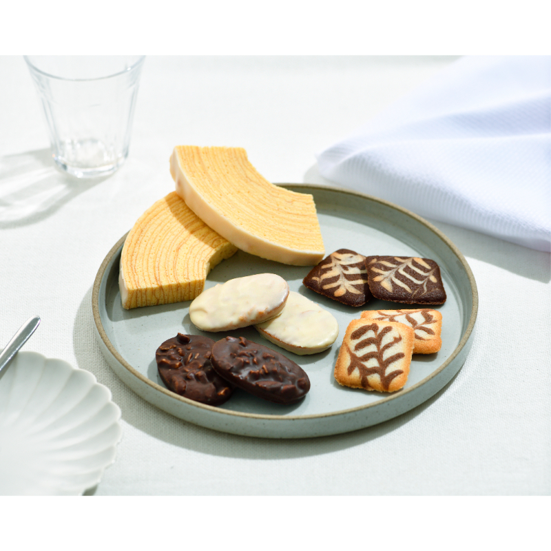 乳化剤や膨張剤を使わず、しっとりと焼きあげた伝統のバウムクーヘン、薄焼きラングドシャ、冬季限定のショコラサブレを詰め合わせました。
