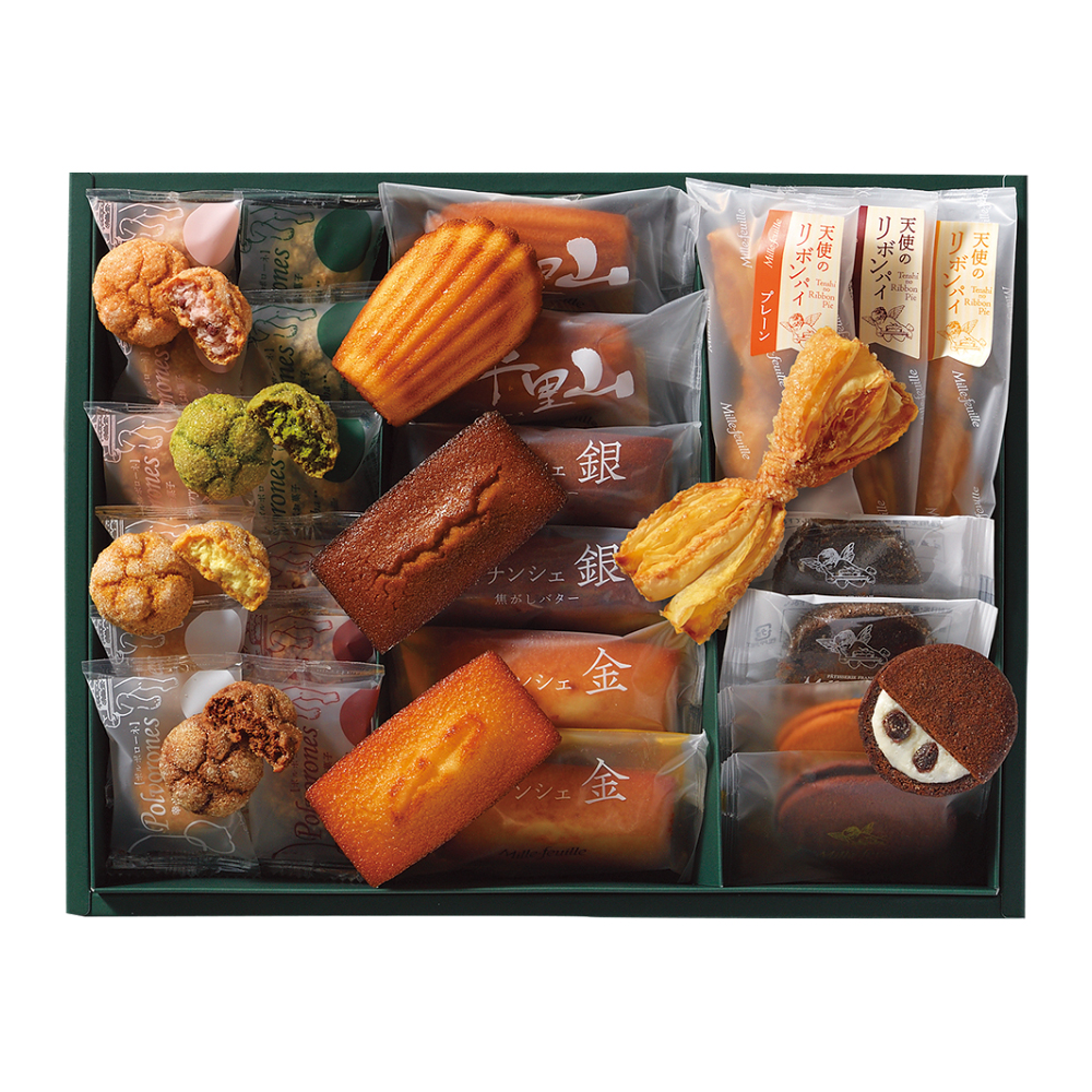 フィナンシェ金・フィナンシェ銀(焦がしバター)・千里山マドレーヌ・チョコチップクッキー各2、天使のリボンパイ3種、クリームサンドラング2種、ポルポローネ(プレーン・いちご・チョコ・抹茶)各3