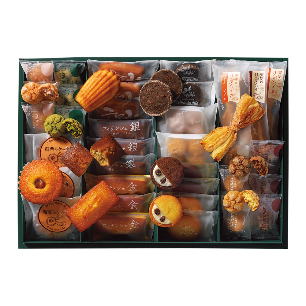 フィナンシェ金・フィナンシェ銀(焦がしバター)・千里山マドレーヌ・蜜栗のケーキ各3、チョコチップクッキー×2、天使のリボンパイ3種、クリームサンドラング2種各2、ココナッツミルク4個入、マカロンベリー4個入、ポルポローネ4種各3