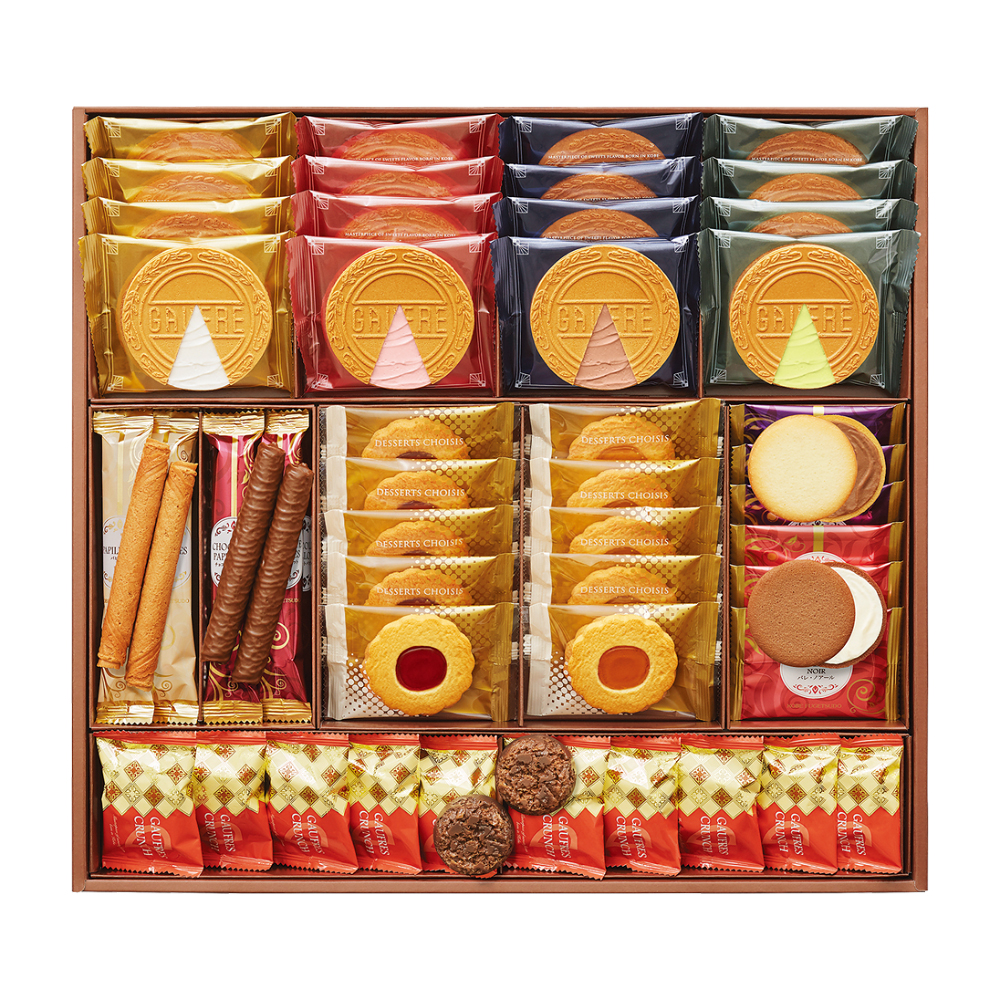 プティーゴーフル×32(2枚入×16)、パレオショコラ・パレノアール各3、パピヨット・チョコレートパピヨット各4、ジャムトップ×10(ラズベリー・アプリコット各5)、ゴーフルクランチ×10