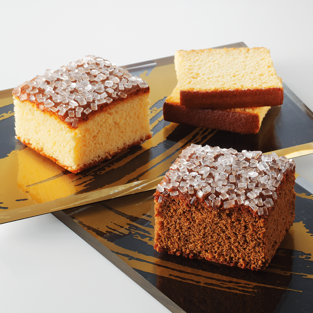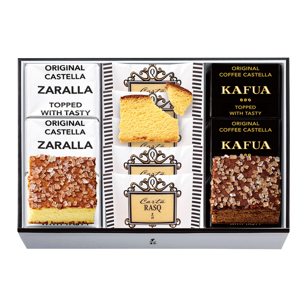 新商品の珈琲ざらめカステラ「カフア」と人気のざらめカステラ「ザラーラ」、カステララスクの冬季限定アソート。