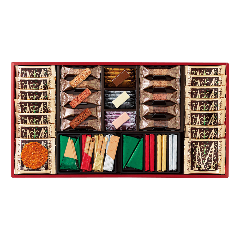 エコルセ×36、マンデルチーゲル×14、ショコラエコルセ×12(ミルクチョコ・ホワイトチョコ・ストロベリーチョコ各4)、米粉クランチ×10(ミルクチョコ・ホワイトチョコ各4、ラズベリーチョコ×2)