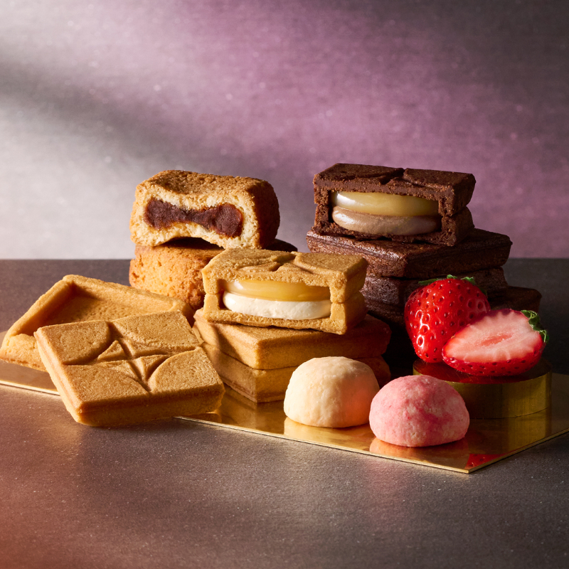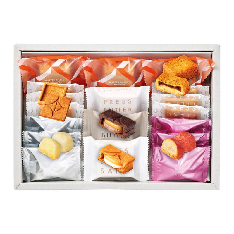 定番のバターサンドとバターサンド〈チョコレート〉、プレスバタークッキー、バターサブレ〈キャラメル〉、2種類のブールドネージュの6種を詰め合わせました。PRESS BUTTER SANDの多彩な美味しさを楽しめる、バラエティに富んだセットです。