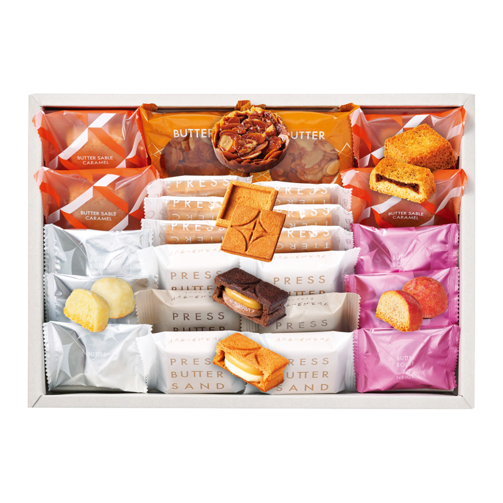 バターサンド×4、バターサンド(チョコレート)×2、バターサブレ(キャラメル)×4、プレスバタークッキー×6、ブールドネージュ・ブールドネージュ(苺)各3、バターフロランタン×2