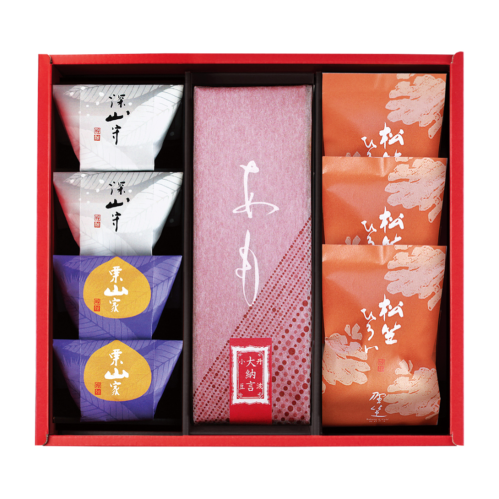 代表銘菓「あも」と、米粉で焼きあげた新商品「松笠ひろい」を中心に詰め合わせました。幅広い世代の方に喜んでいただけるギフトです。