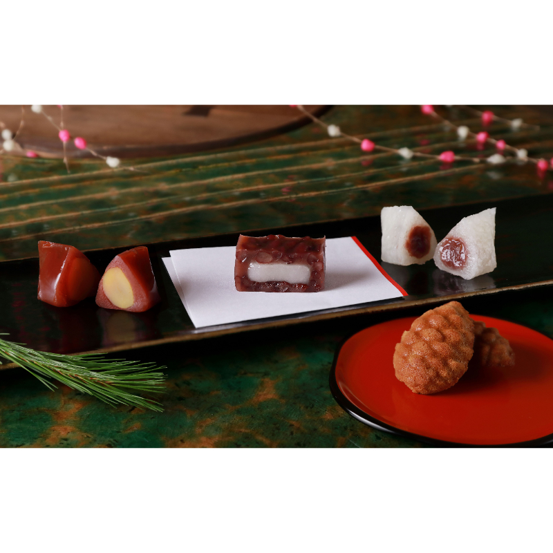 ほろほろとほどけるような小豆でやわらかな羽二重餅をつつみました代表銘菓「あも」。もっちり栗蒸し羊羹の「栗山家」、米粉で焼きあげた黒糖風味の商品「松笠ひろい」など、人気の季節銘菓を詰合せいたしました。
