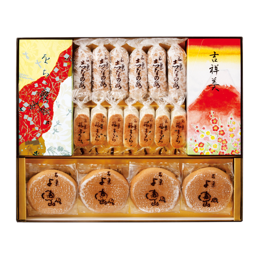 雄大な赤富士を表現した「吉祥羹」、大納言小豆が味わい深い「をちこち」と人気の焼菓子の詰め合わせ。