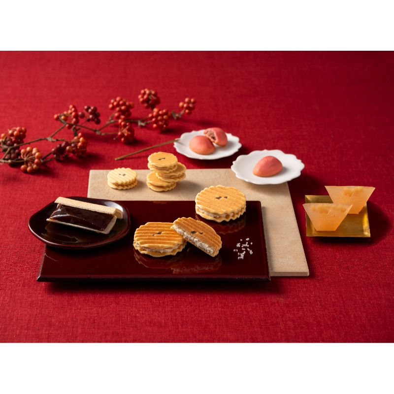 ヴァッフェル生地にシュガークリームを挟んだ「プレミアム千寿せんべい」、苺ミルク風味のおまんじゅう「苺の香}、梅が香る「一枝の梅」、一口サイズの「姫千寿せんべい」、最中種が香ばしい「万都の葉」。芳醇な和を感じる京菓子の詰合せです。