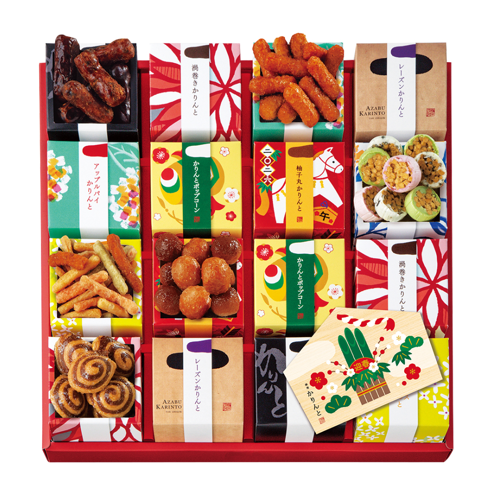 かりんと:うずまき×3、黒糖・レーズン・野菜・アップルパイ・柚子丸・ポップコーン各2、梅ばち