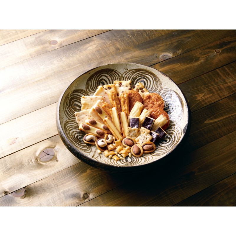 チーズおかき2種10袋、揚げおかき2種13袋、チョコおかき2種15袋、海苔羽衣・胡麻白醤油各11袋、松の実あられ8袋、草加小丸・海老焼塩各3袋、黒豆おかき2袋 計12種76袋