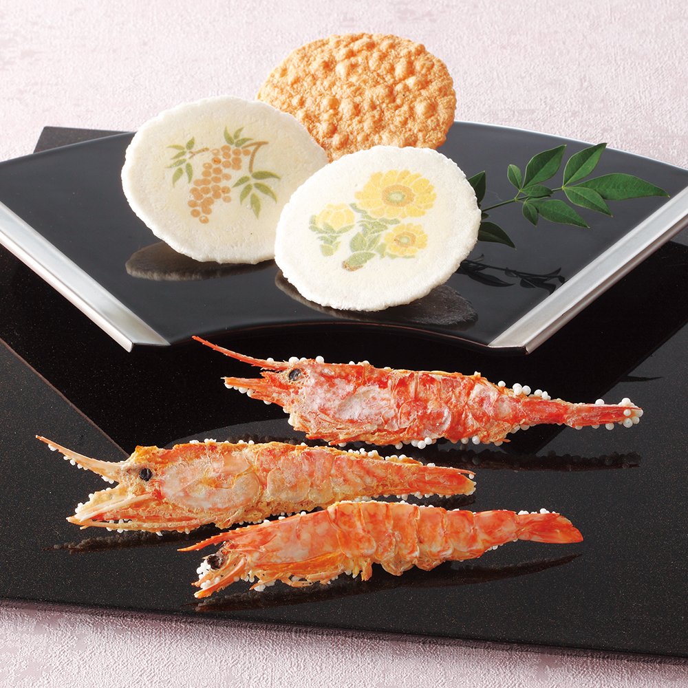 国産車えびや北海道産ぼたんえび・甘えびの「姿焼き」、赤えびの「炙り焼き」と季節の絵柄のえびせんべい。