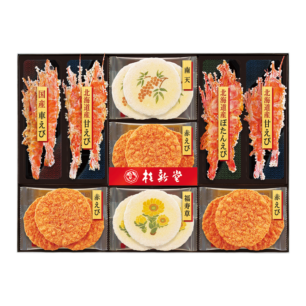 姿焼き(国産車えび・北海道産ぼたんえび)、姿焼き(北海道産甘えび)2カップ、炙り焼き(赤えび)9袋、南天・福寿草各3袋