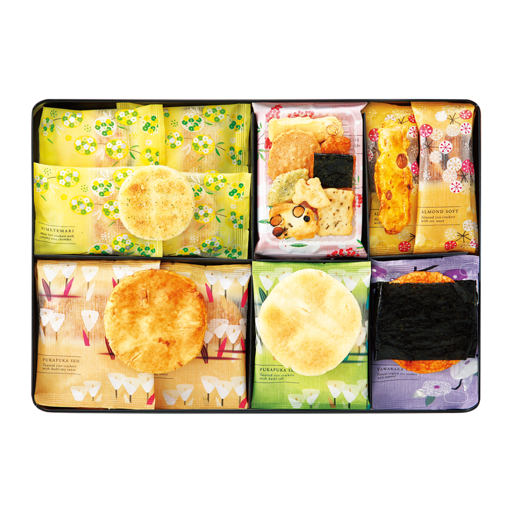 ぐるめ探訪冬小路(あられ8種入)×4、やわらか焼のり巻×4、姫てまりコーンポタージュ×13、ぷかぷか煎:だし塩×5・だし醤油×9、アーモンドそふと直火炊き醤油×8