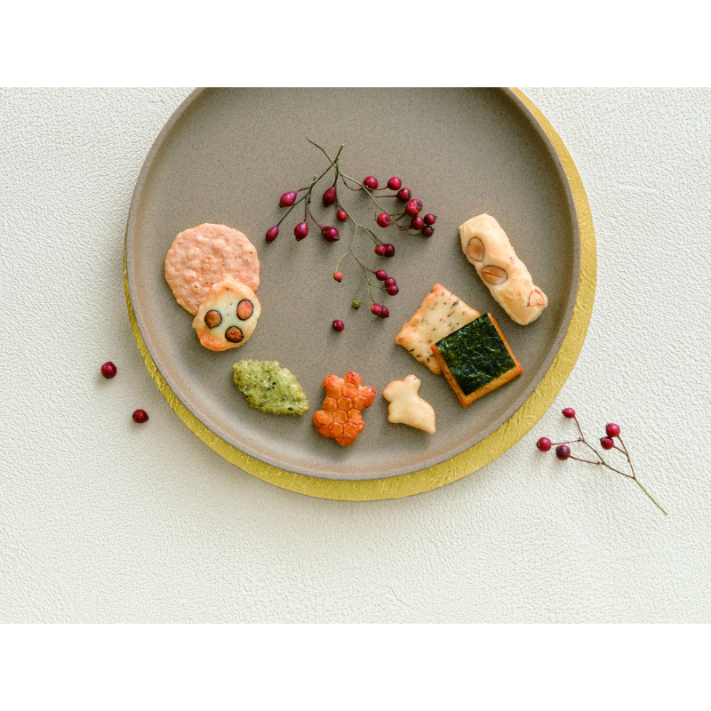 ひなげしの花を描いた定番の「ぐるめ探訪」と、冬の風物詩である南天と雪うさぎを描いた「ぐるめ探訪 冬小路」を一箱に詰合せました。それぞれ8種の小粒あられを一袋に包んだバラエティー豊かな味わいをお楽しみください。