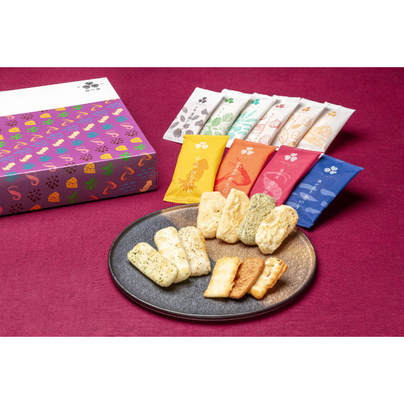 富山湾白えび・磯の香り青のり・富山湾ほたるいか・加賀能登甘えび各3袋、バージンオリーブオイル・スイートバジル・サワークリームオニオン・アーモンドミモレット各4袋、黒糖アーモンド・スモークチーズ各6袋 計40袋
