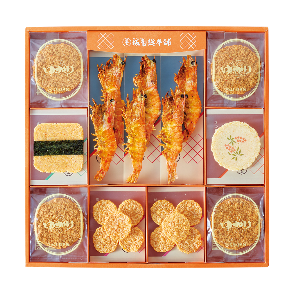 ゆかり×16、姫ゆかり×4、姿焼き(国産車海老)×6、ふくみ焼き(伊勢湾黒海苔)・はさみ焼き(季節の花)各4