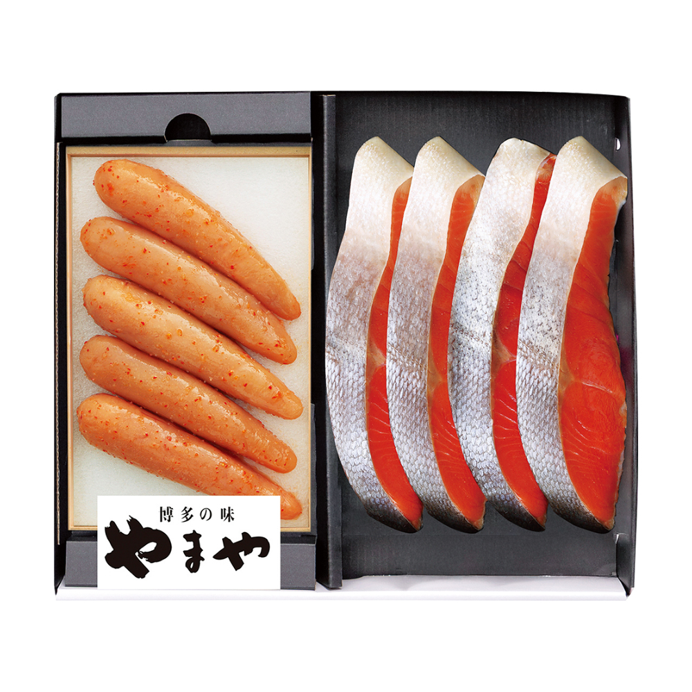 無着色辛子明太子3~7本150g(密封袋入)、紅鮭切身70g×4 原料原産地:スケトウダラの卵・サケ(ロシア)
