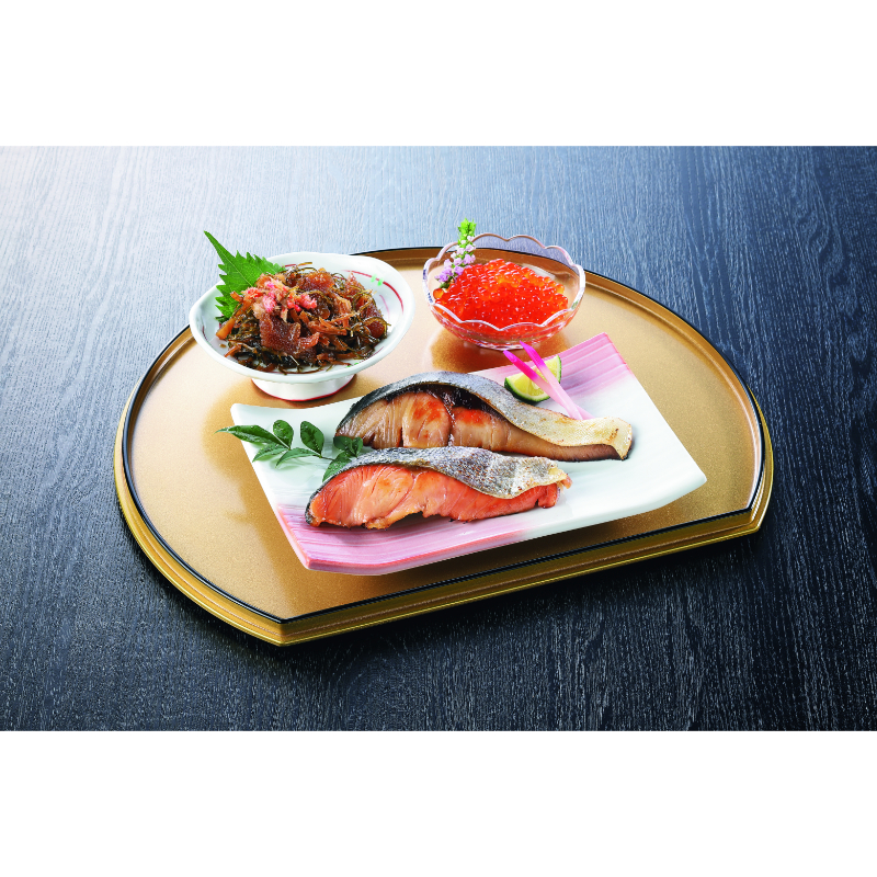 西京漬(鮭60g×2、アラスカメヌケ・ぶり・真だら各60g)、味付け松前漬(ズワイガニ入り)110g、味付け数の子100g、いくら醤油漬60g×2