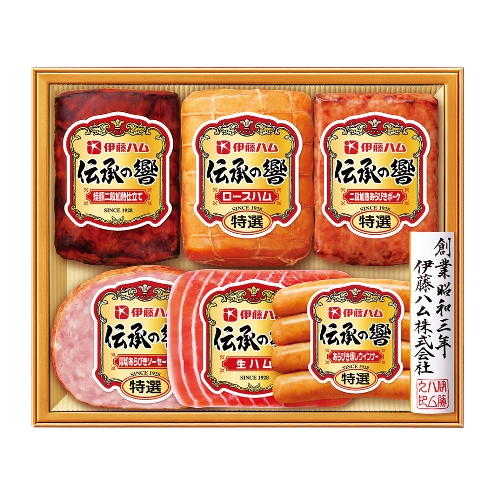 特選ロースハム320g、焼豚二段加熱仕立て160g、生ハム45g、二段加熱あらびきポーク110g、あらびき燻しウインナー80g、厚切あらびきソーセージ80g