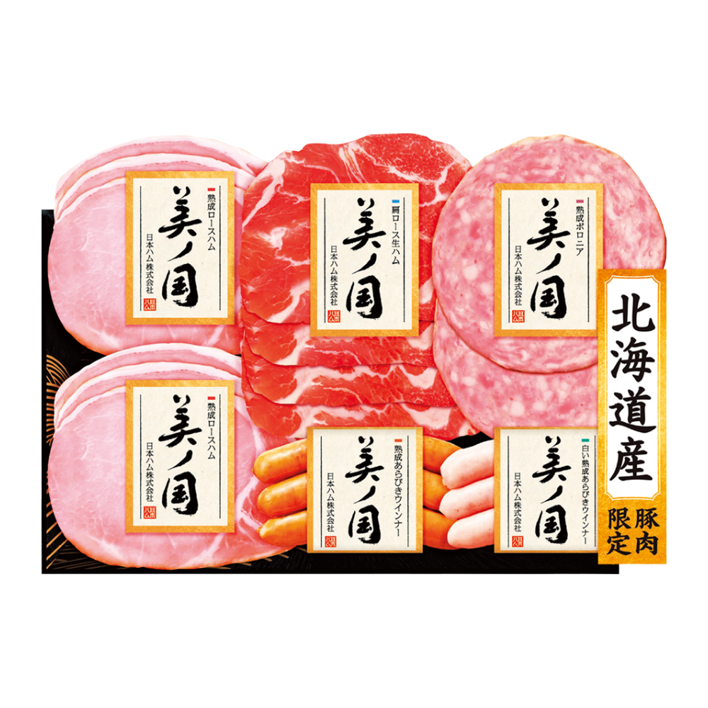 熟成ロースハム45g×2、熟成ボロニア48g、肩ロース生ハム30g、熟成あらびきウインナー・白い熟成あらびきウインナー各60g