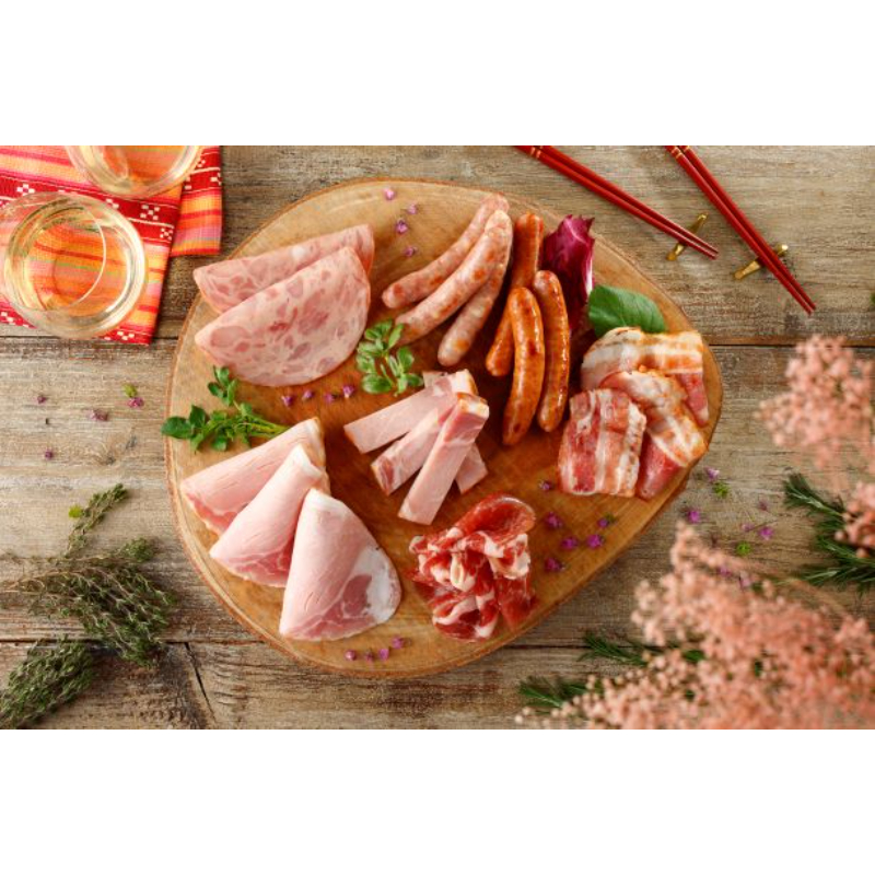 熟成ロースハム45g×2、熟成ロースハムステーキ50g×2、熟成あらびきステーキ47g、熟成ボロニア48g、熟成ビアシンケン40g、肩ロース生ハム30g、熟成あらびきウインナー・白い熟成あらびきウインナー各60g