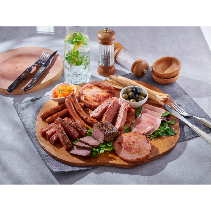直火焼ローストビーフ110g、ローストビーフソース30g、スモークボロニア105g、ロース生ハム27g、特撰あらびきウインナー・特撰ホワイトウインナー各66g 原料原産地:牛肉(オーストラリア)