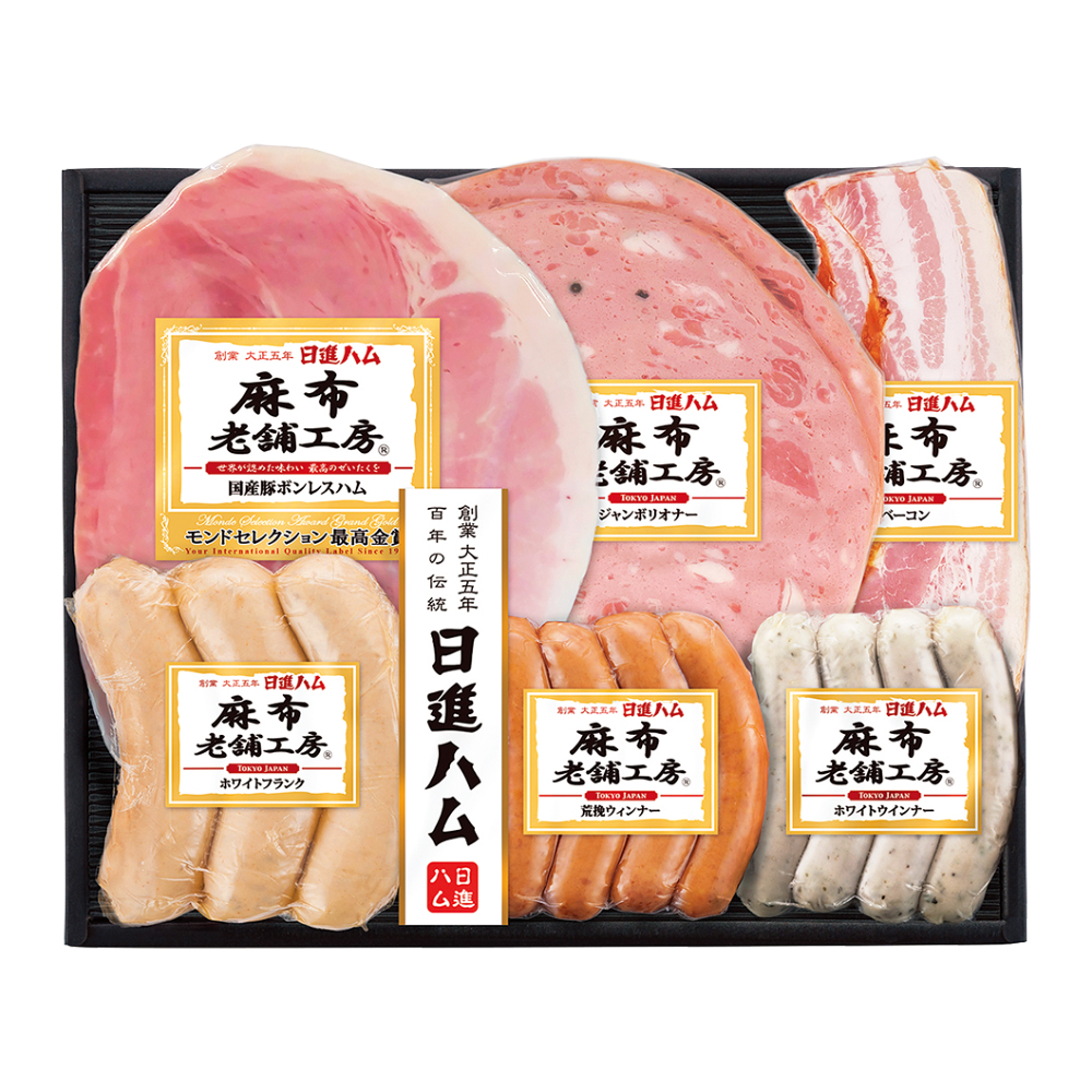 国産豚ボンレスハム120g、ジャンボリオナー80g、ベーコン50g、ホワイトフランク192g、荒挽ウインナー86g、ホワイトウインナー78g