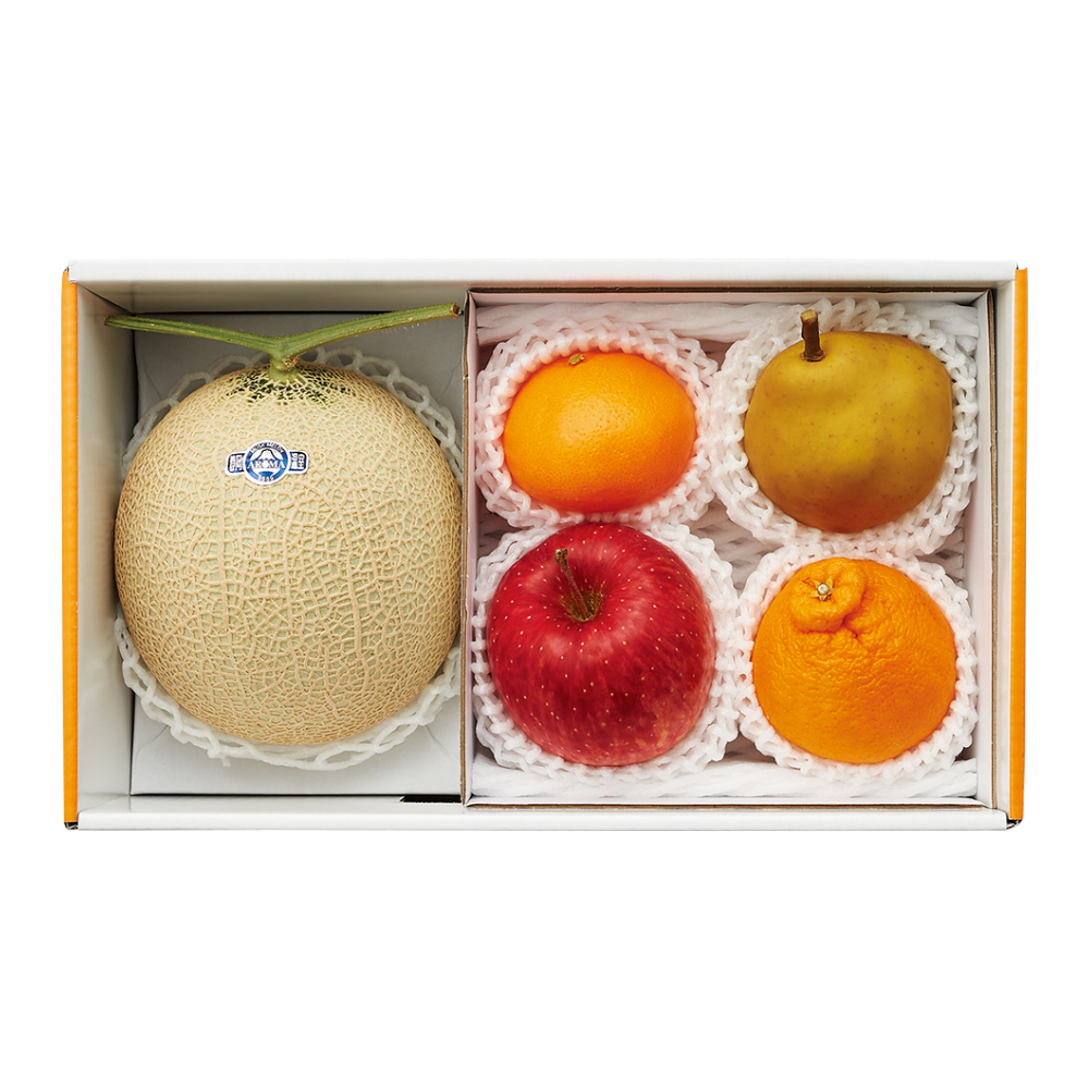 静岡県産マスクメロン1玉、青森県産サンふじりんご・山形県産ラ フランス・愛媛県産紅まどんな・国産デコポン各1、計2.3kg