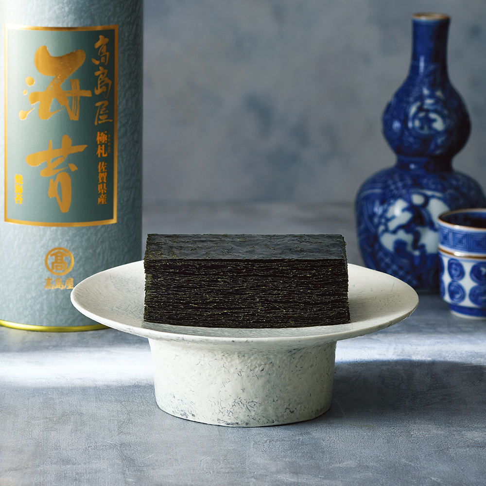日本有数ののり産地、佐賀県有明海域で、一日の干満差約6mという自然環境を利用した支柱栽培で養殖されたのり。満潮時には水没して海の栄養を吸収し、干潮時は日光に殺菌され、光合成で旨みを蓄えます。初摘み日から3日以内に採取した一番摘みの中から、味、香り、色艶に優れた上位の原料を選び、丹念に加工した自信作です。