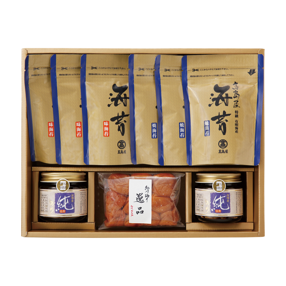 焼のり・味のり各8切26枚×3、純のり佃煮130g×2、南高梅約140g 原料原産地:海苔(有明海)、梅(和歌山県)