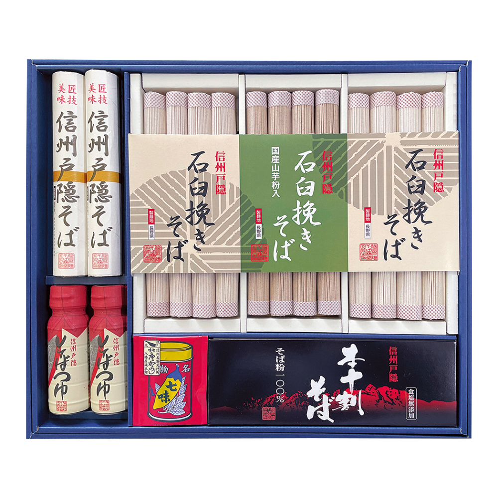 石臼挽きそば(70g×4束)×2、山芋粉入石臼挽きそば(70g×4束)、信州戸隠そば150g×2束、本十割そば150g、つゆ(濃縮)100ml×2、八幡屋七味唐辛子8g