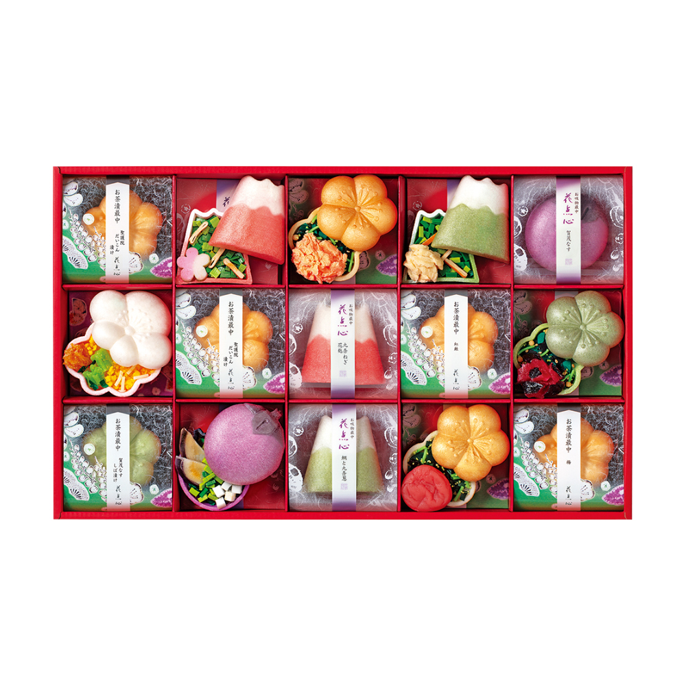赤富士、青富士などを模した最中種にこだわりの具材を入れた、京風お茶漬・お吸物の詰め合わせ。