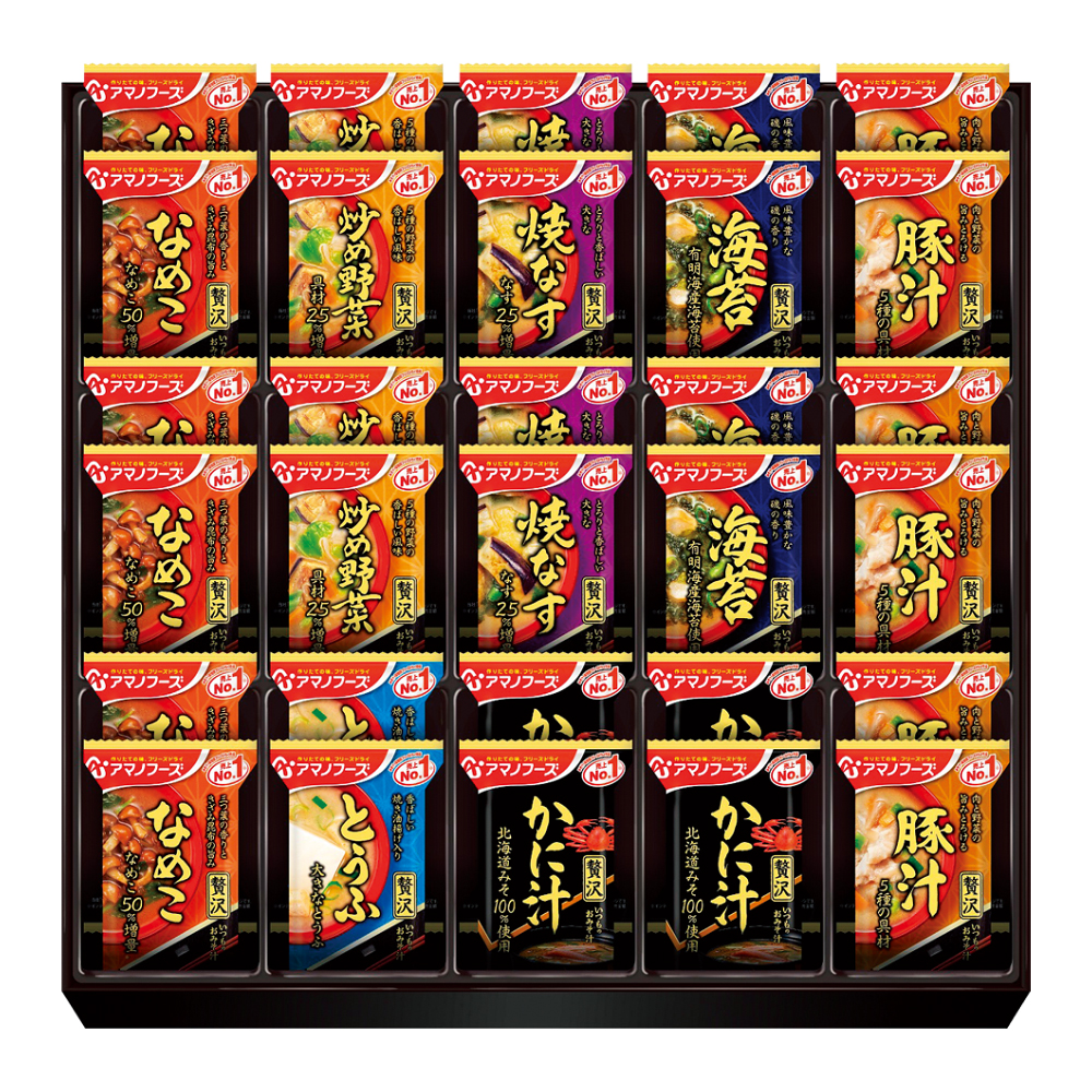 いつものおみそ汁贅沢(なめこ・豚汁各6、炒め野菜・焼なす・海苔・かに汁各4、とうふ×2)計30食