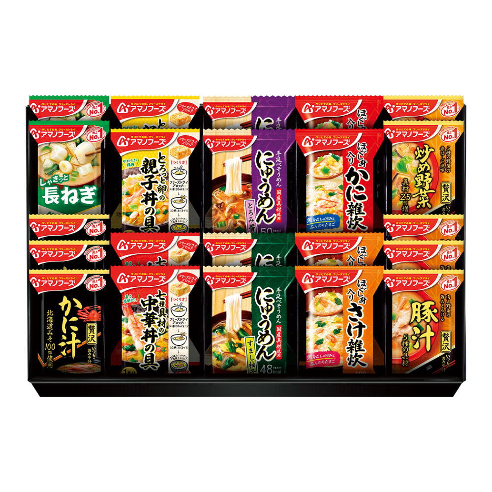 親子丼の具・中華丼の具・にゅうめん(とろみ醤油・すまし柚子)・雑炊(かに・さけ)各2、いつものおみそ汁贅沢(かに汁・豚汁各3、炒め野菜×2)、いつものおみそ汁(長ねぎ×2)計22食