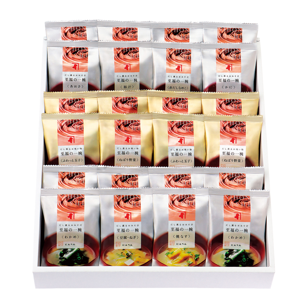 おみそ汁(わかめ×4、豚汁・赤だしなめこ・かに・あおさ・焼なす・豆腐ねぎ各2)、お吸い物(ふわっと玉子・ねばり野菜各4)計24食