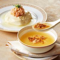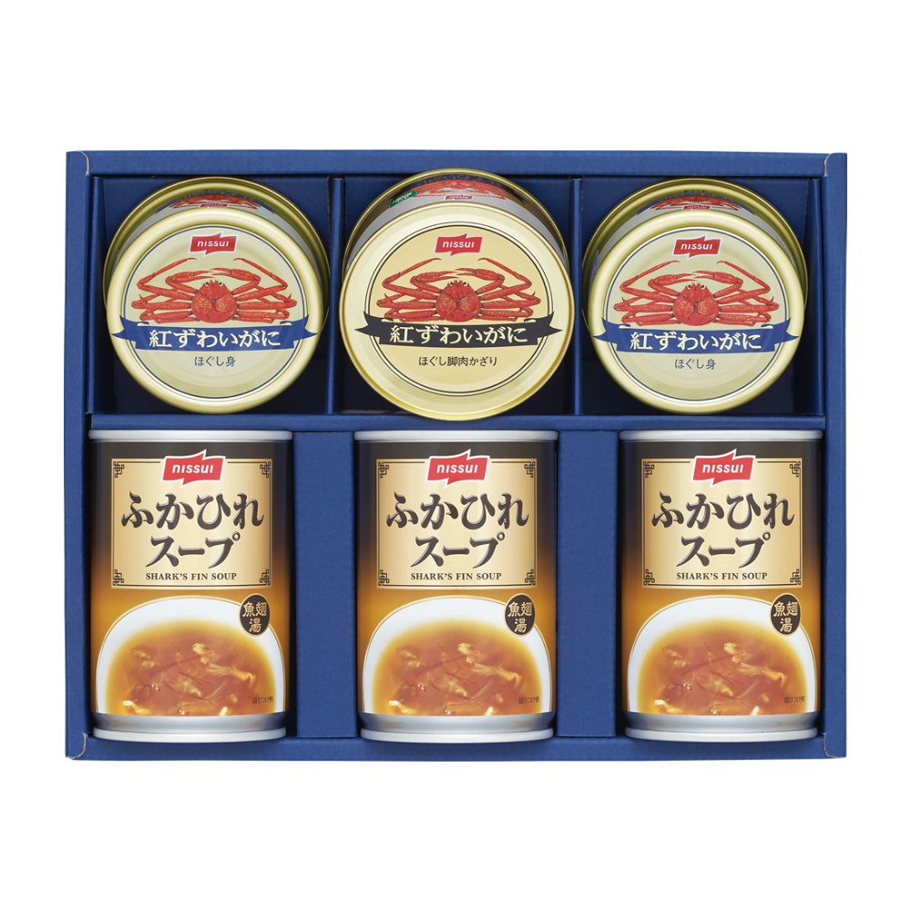 ふかひれスープ285g×3、紅ずわいがにほぐし脚肉飾り50g、紅ずわいがにほぐし身55g×2