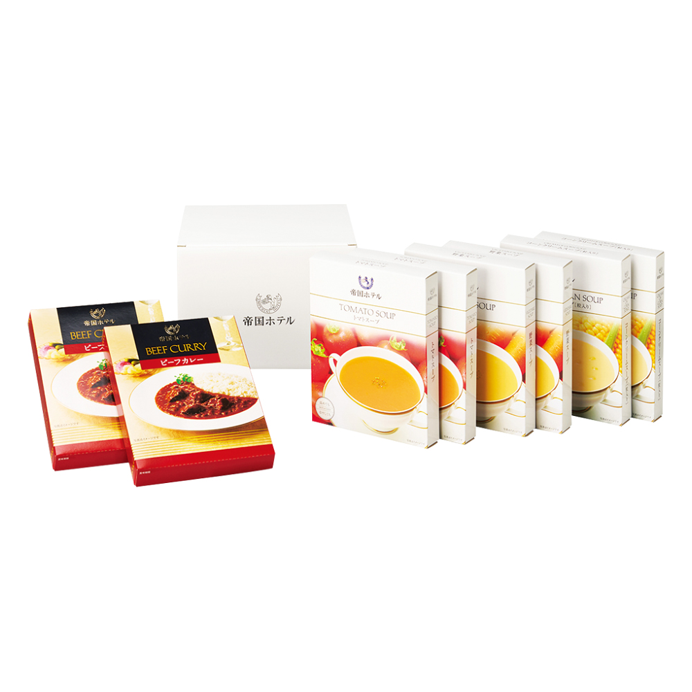 ビーフカレー180g×2、コーンクリームスープ(粒入り)・トマトスープ・野菜スープ各150g×2※3種類のスープは温めても冷やしてもおいしくお召しあがりいただけます。