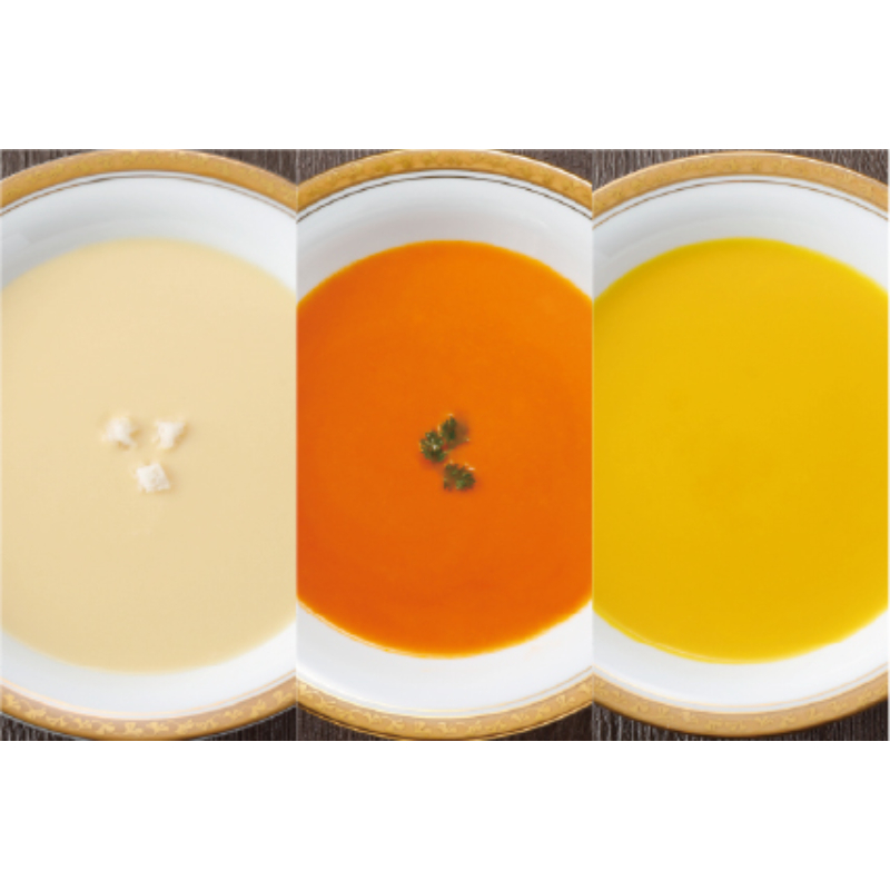 コーン、パンプキン、8種の野菜ポタージュのスープ3種類のセットです。湯煎で温めるだけで簡単にお召し上がりいただけます。耐熱容器に移してラップをかければ電子レンジ調理も可能です。