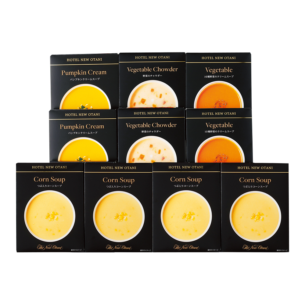 つぶ入りコーンスープ150g×4、パンプキンクリームスープ・10種野菜のクリームスープ・野菜のチャウダー各150g×2