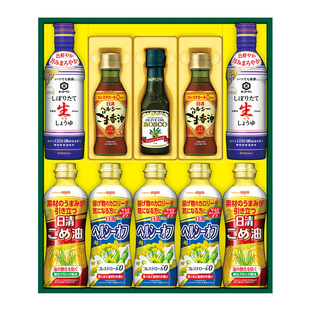 ヘルシーごま香油145g×2、ボスコエキストラバージンオリーブオイル140g、こめ油×2・ヘルシーオフ×3 各350g、キッコーマンしぼりたて生しょうゆ450ml×2