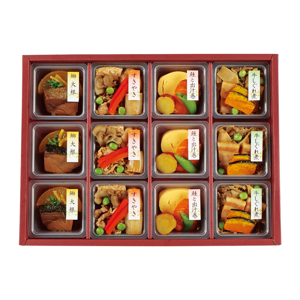 鮭と出汁巻・鰤大根各55g×3、牛しぐれ煮70g・すきやき85g各3計12個 ※電子レンジ対応 お届け時期:12月25日まで(承り期間:12月19日まで)