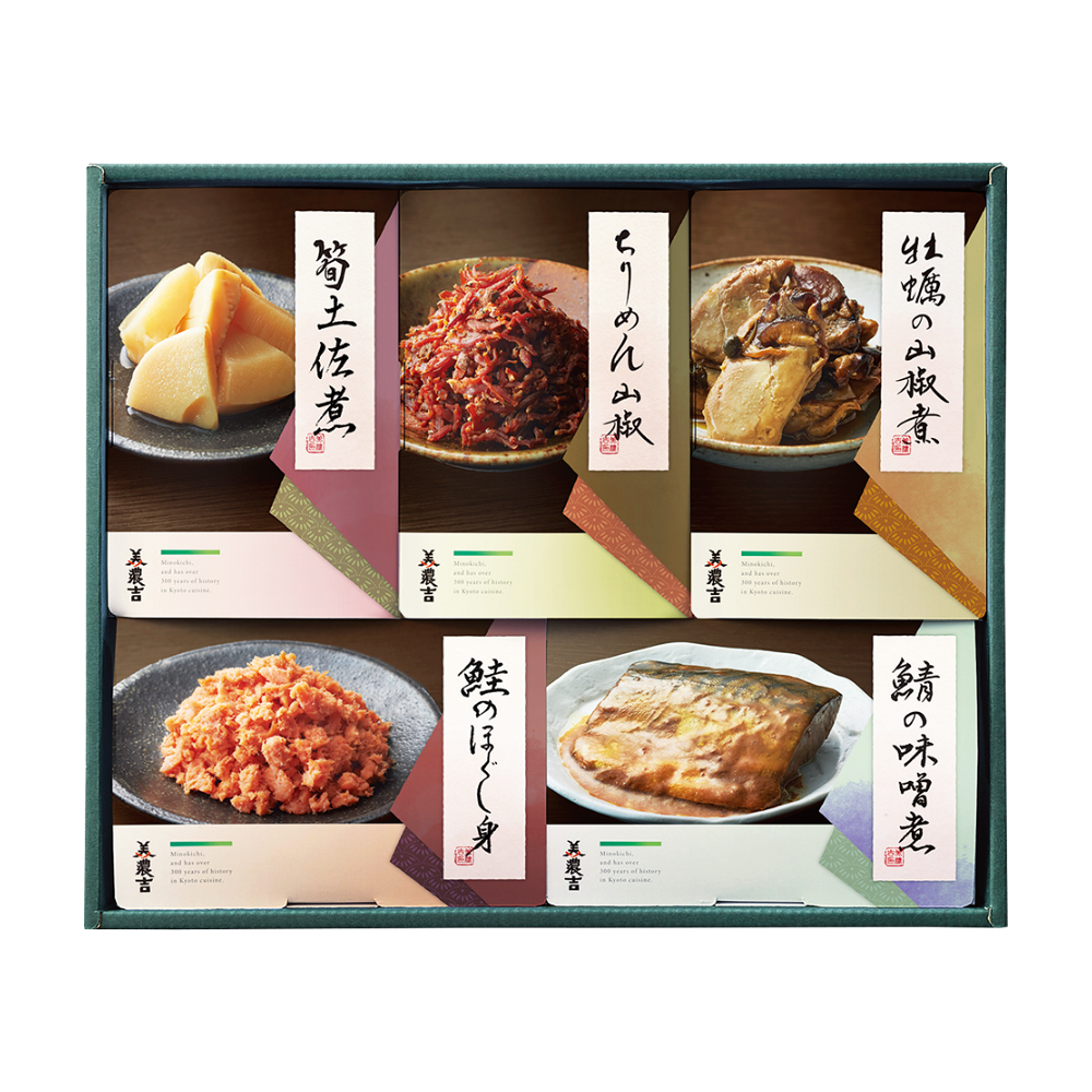 筍土佐煮・ちりめん山椒・牡蠣の山椒煮・鮭のほぐし身各40g、鯖の味噌煮70g