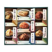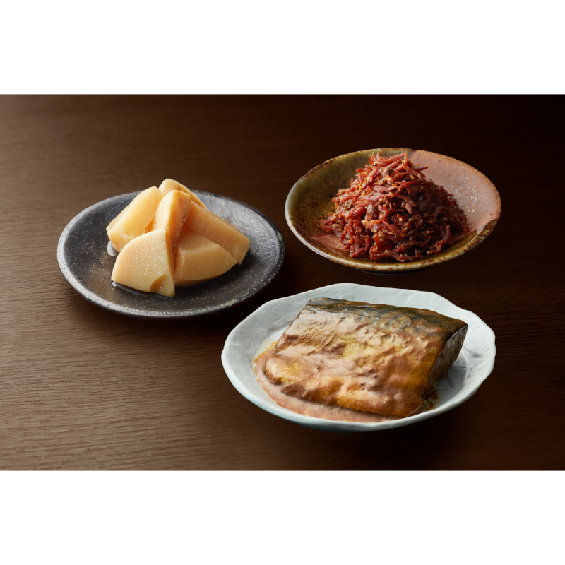 牡蠣の山椒煮・ちりめん山椒・筍土佐煮・鮭のほぐし身各40g、牛肉ごぼう50g、伏見唐辛子味噌60g、鯖の味噌煮70g