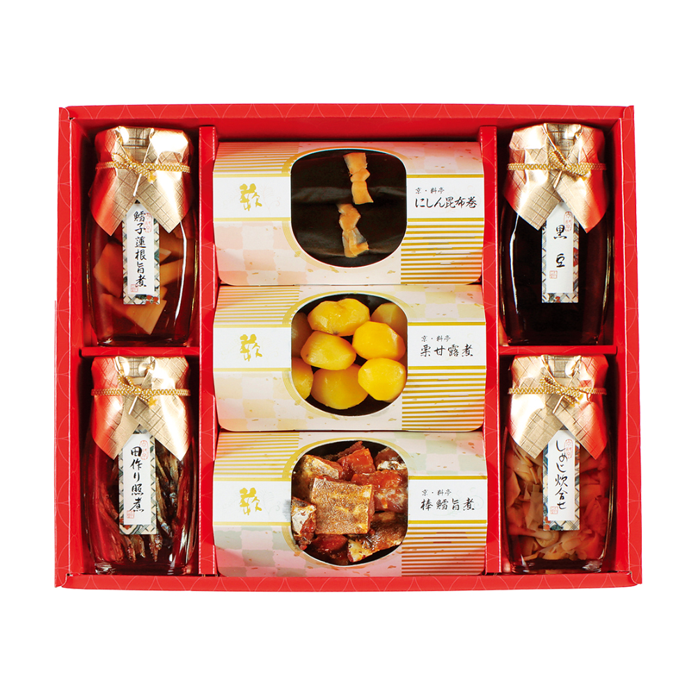 にしん昆布巻2本入、栗甘露煮55g、棒鱈旨煮85g、田作り照煮20g、黒豆45g、しめじ炊合せ50g、鱈子蓮根旨煮40g