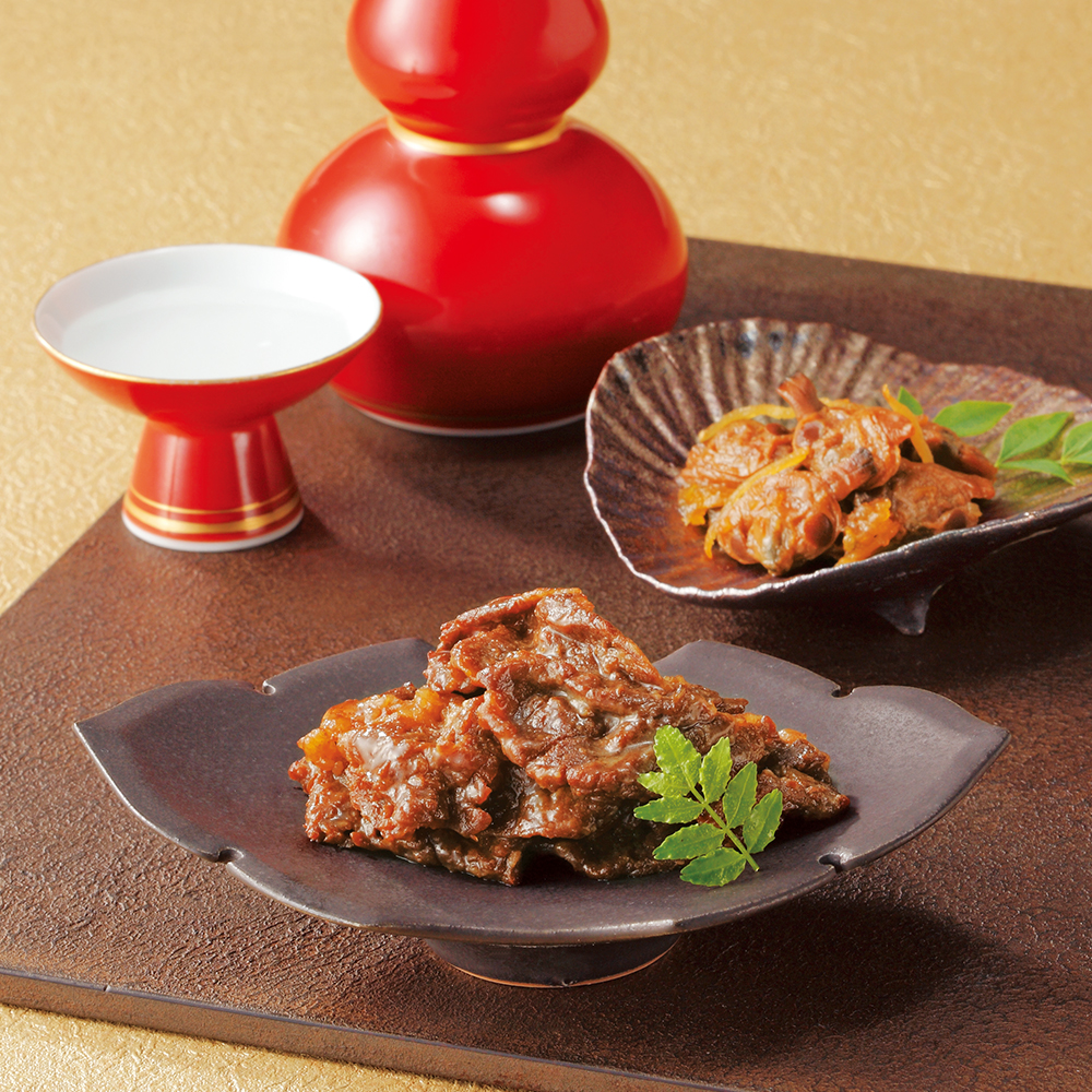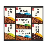 牛肉しぐれ50g×2、牛肉ごぼうしぐれ煮・減塩鰹こんぶ・竹の子旨煮各50g、あさりのはちみつ生姜煮40g、そぼろ味噌味あわせ90g