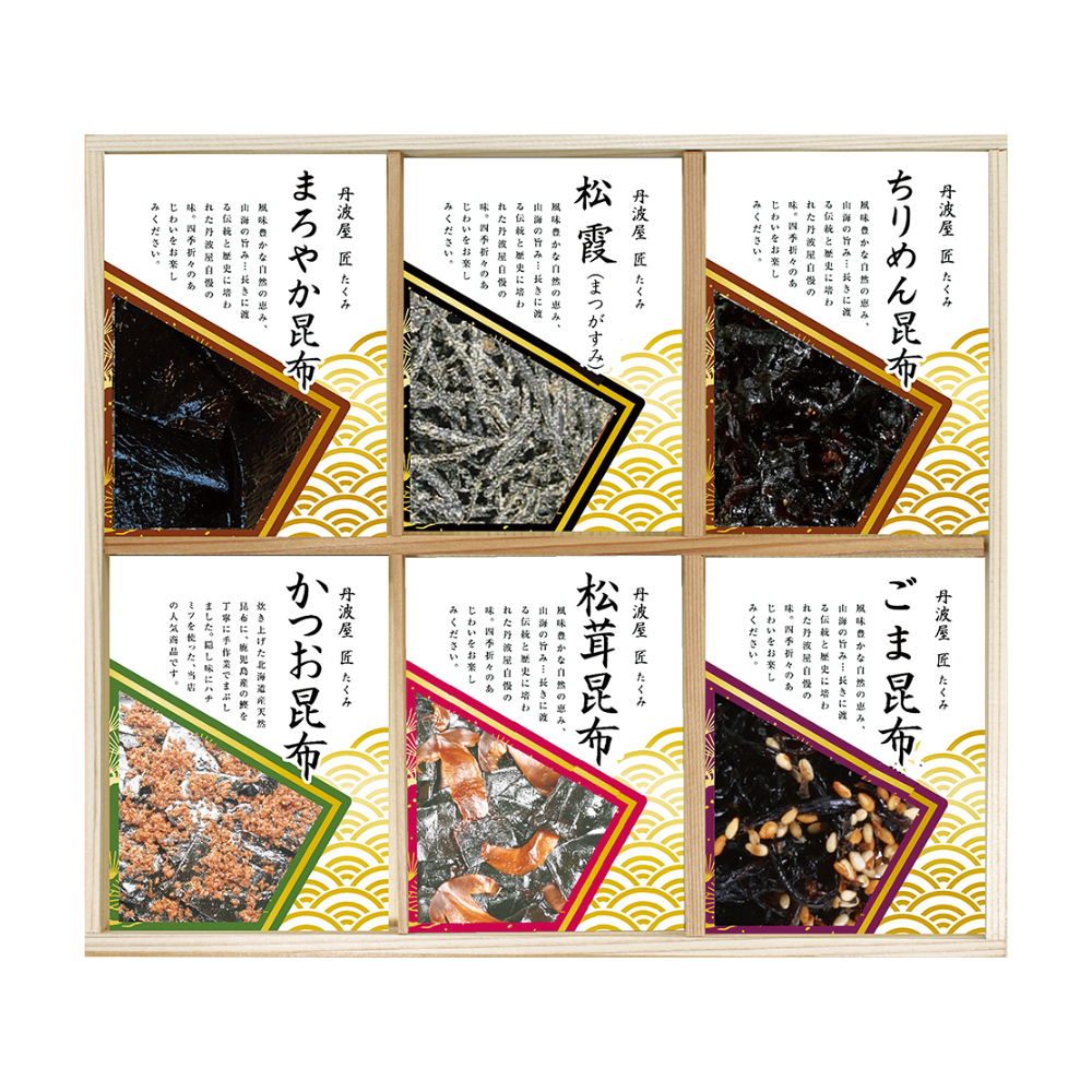 松茸昆布57g、ちりめん昆布・ごま昆布各46g、松霞25g、かつお昆布58g、まろやか昆布67g 原料原産地:松茸(中国)