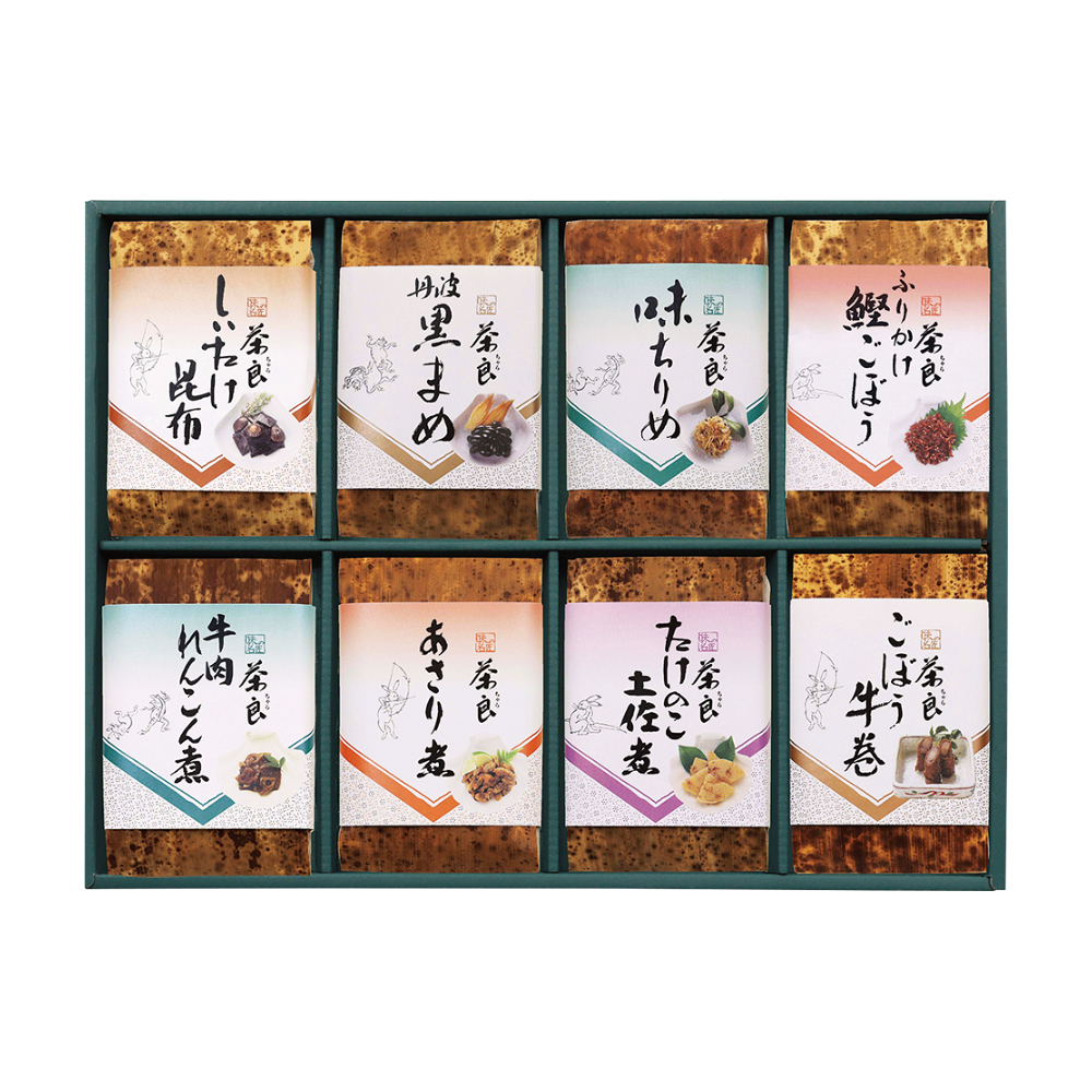 しいたけ昆布85g、牛肉れんこん煮・ごぼう牛巻各60g、たけのこ土佐煮75g、あさり煮40g、丹波黒まめ95g、ふりかけ鰹ごぼう48g、味ちりめ35g