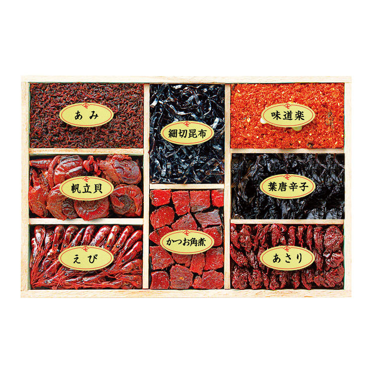 帆立貝60g、かつお角煮・あさり・細切昆布各50g、あみ・味道楽各40g、えび・葉唐辛子各30g